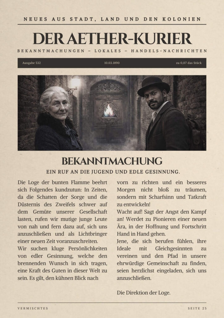 In den regennassen Straßen der Stadt liefern sich motorisierte Droschken, Pferdefuhrwerke, Lieferanten mit Handkarren und zahllose Fußgänger*innen einen endlosen Kampf. Hoch über den Dächern gleiten Luftschiffe durch den rauchigen Himmel. Zu dem Lärm und Gestank auf der Straße gesellt sich das ferne Dröhnen schwerer Maschinen und kohlebetriebener Öfen. Über allem liegt ein diffuses Gefühl der Bedrohung und Verunsicherung. Man sieht es in den gehetzten Blicken der Menschen, an ihren hochgezogenen Schultern und ihren wütenden Gesten. Aus den Schatten der Nebenstraßen dringt das Gefühl wie ein schwarzer Nebel in ihre Gemüter ein.